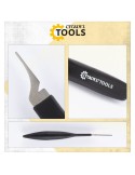 – Una parte posterior con muescas diseñada para limpiar los bordes cónicos de sus peanas, lo que hace que sea rápido y fácil dejarlas listas para pintar