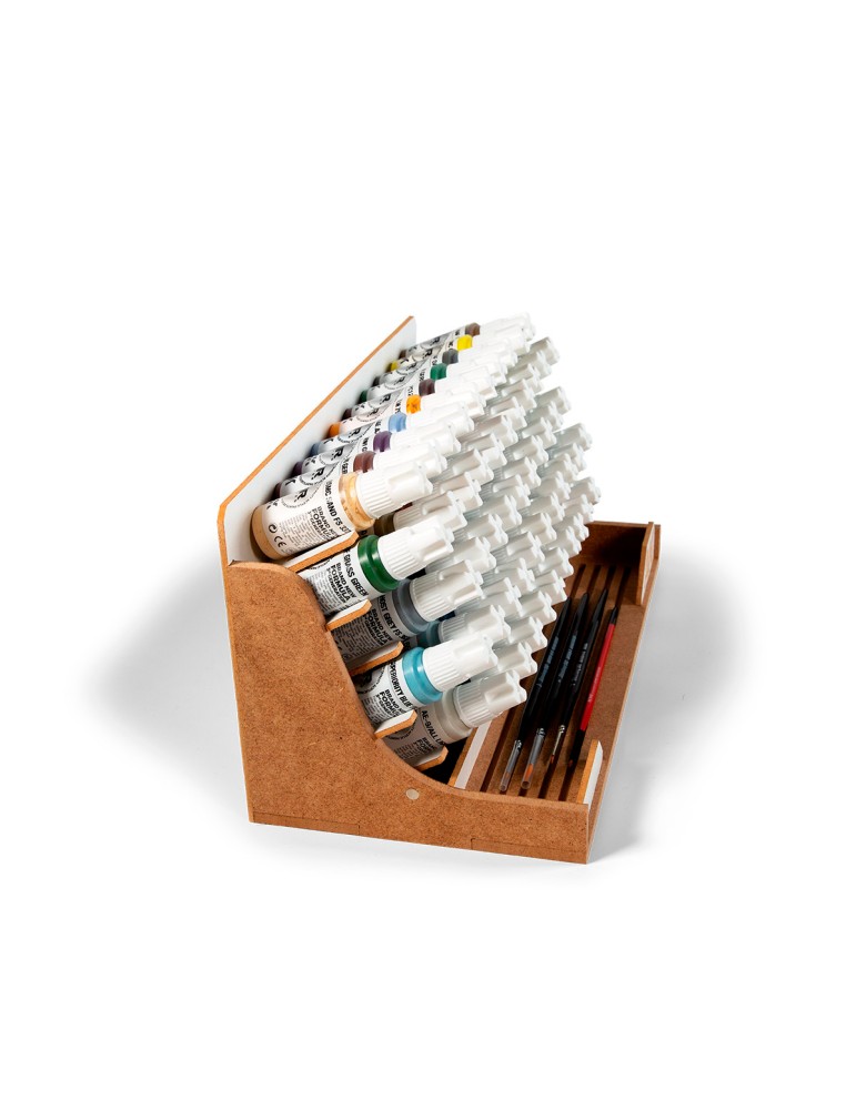 Organizador modular para 52 botes de pintura de 17 ml. Compatible con Hobby Zone, en madera reforzada y con espacio frontal para pinceles y herramientas