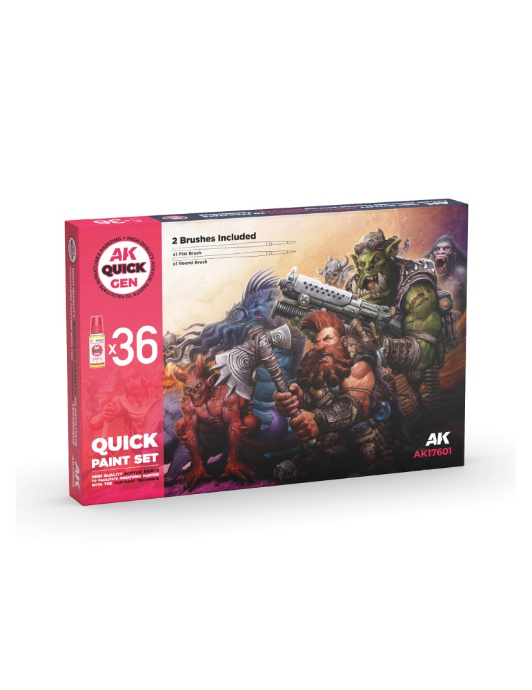 Set de 36 colores Quick Gen para pintar ejércitos rápidamente. Incluye 2 pinceles sintéticos de regalo. Ideal para empezar o ampliar tu paleta