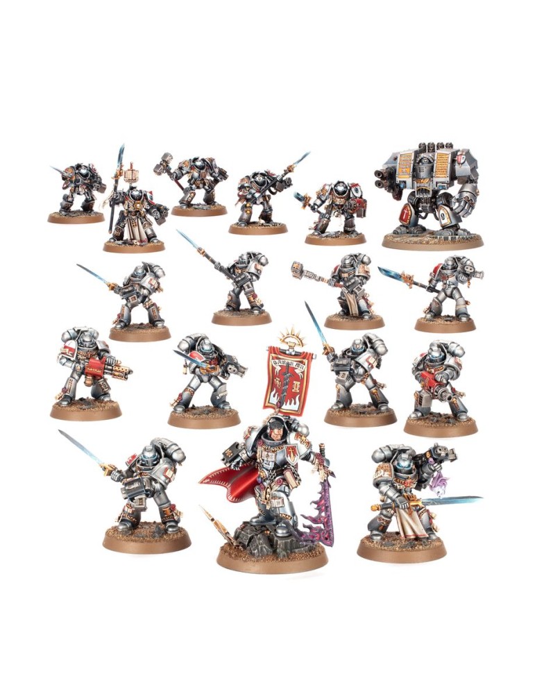 Purifica la galaxia del caos con la Patrulla: Caballeros Grises. Liderada por el legendario Castellano Crowe, esta fuerza incluye tropas de choque, exterminadores y un Dreadnought Venerable.