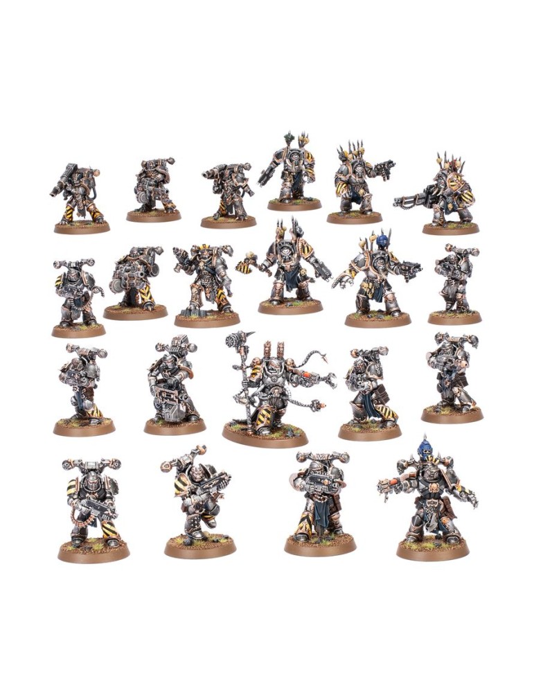 Los Guerreros de Hierro son maestros del asedio, especialistas en demoler defensas y avanzar sin descanso bajo una lluvia constante de fuego. Liderados por siniestros Herreros Disformes, combinan tecnología infernal con una disciplina implacable para aplastar a sus enemigos.