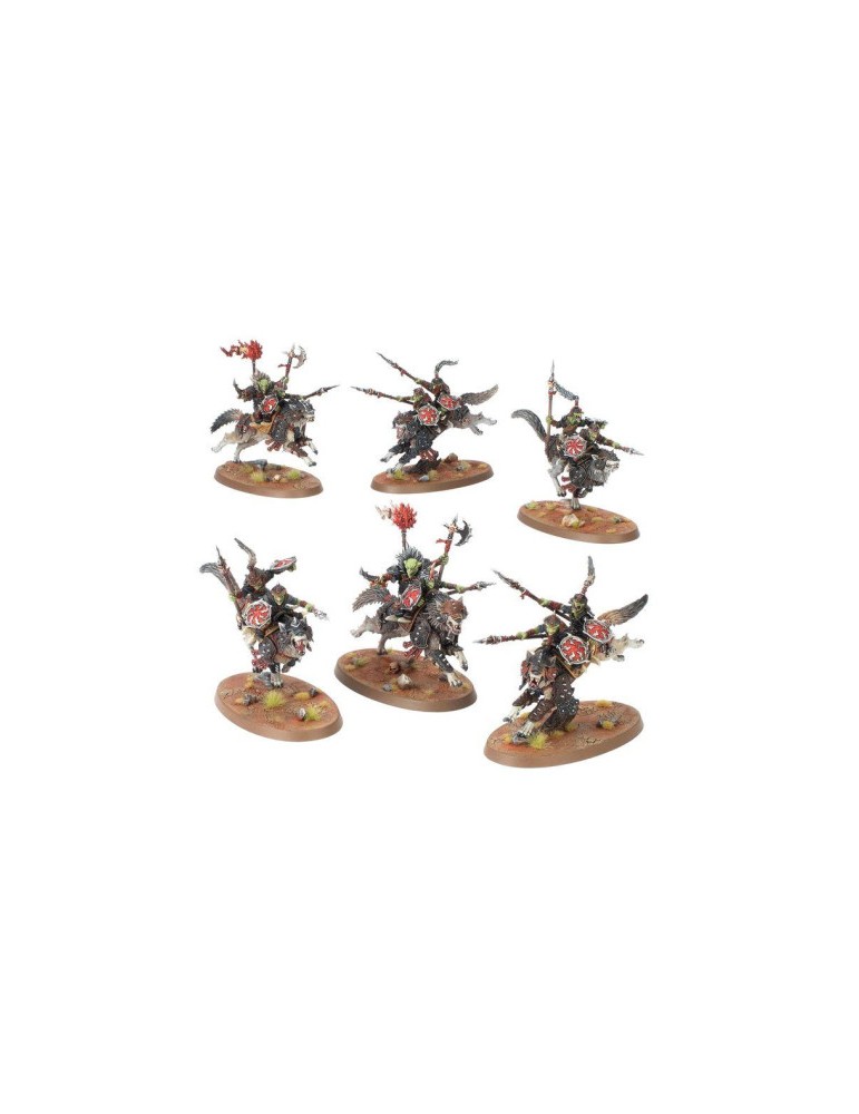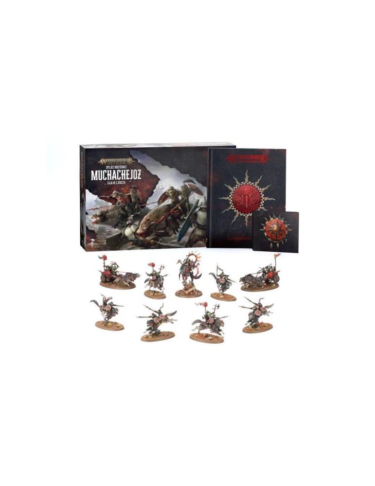 Esta caja de ejército reúne una fuerza rápida, agresiva y muy temática para Gloomspite Gitz, perfecta para empezar colección o ampliar tu horda con una potente base de caballería. Y además incluye en primicia el nuevo Tomo de batalla con cubierta exclusiva.