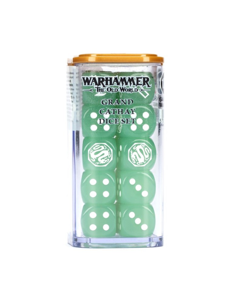 Un juego de 20 dados de seis caras con esquinas redondeadas para usarlos en partidas de Warhammer: The Old World, con temática de los Armies of Grand Cathay. Están fabricados en plástico acrílico de color verde jade con muescas y detalles en blanco y miden 16 mm de arista. En los dados de seis caras, las caras del 1 al 5 están marcadas con los tradicionales puntos, mientras que la cara
