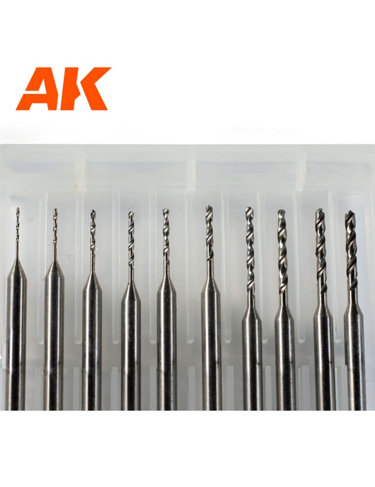 Set de 10 brocas de carburo (0,4 a 1,3 mm) con vástago del mismo diámetro. Perfectas para taladrar miniaturas con máxima precisión