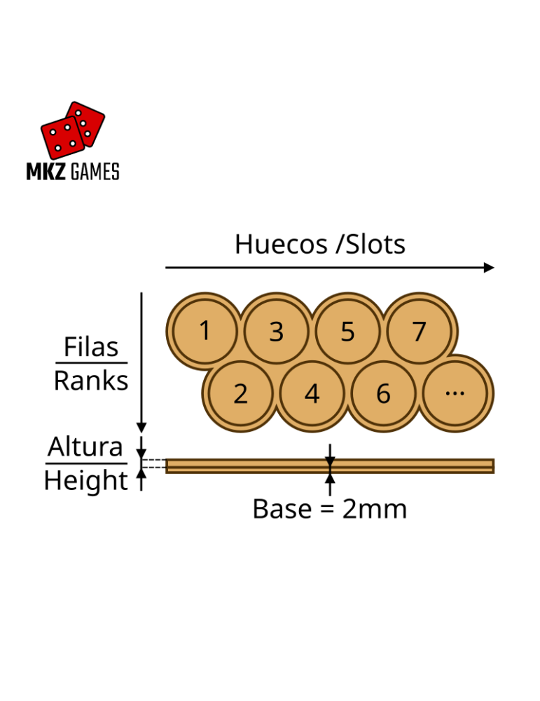 Esta versión cuenta con 2 filas y 5 huecos totales, con un marco de 3 mm de altura, especialmente recomendado para miniaturas de escala 28 mm o superior, como las que se usan habitualmente en Warhammer, Age of Sigmar o Kill Team.