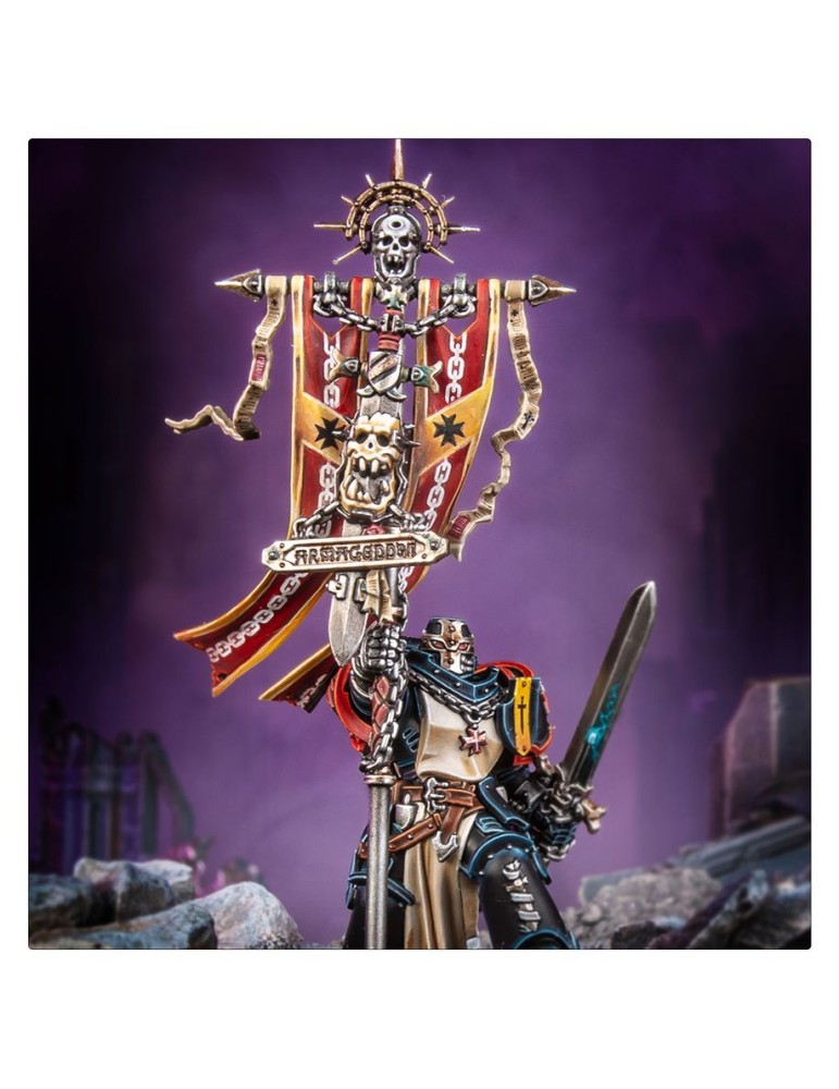 El Anciano Cruzado alza los estandartes del Imperium en pleno combate, guiando a los Templarios Negros con fervor y acero. Una figura central cargada de simbolismo y poder para tu ejército.