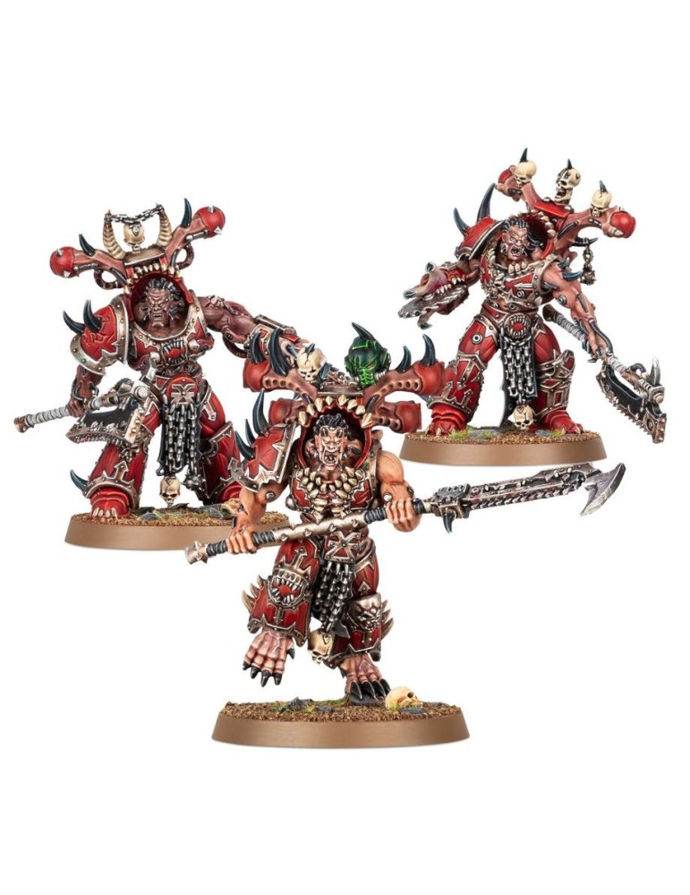 Este kit multicomponente de plástico permite montar tres Octojurados Exaltados, bestias de combate mutadas que representan la apoteosis de los Bersérkeres poseídos. Sus cuerpos deformados y sus armaduras biomecánicas se combinan con un arsenal brutal de armas sierra fusionadas a su carne.